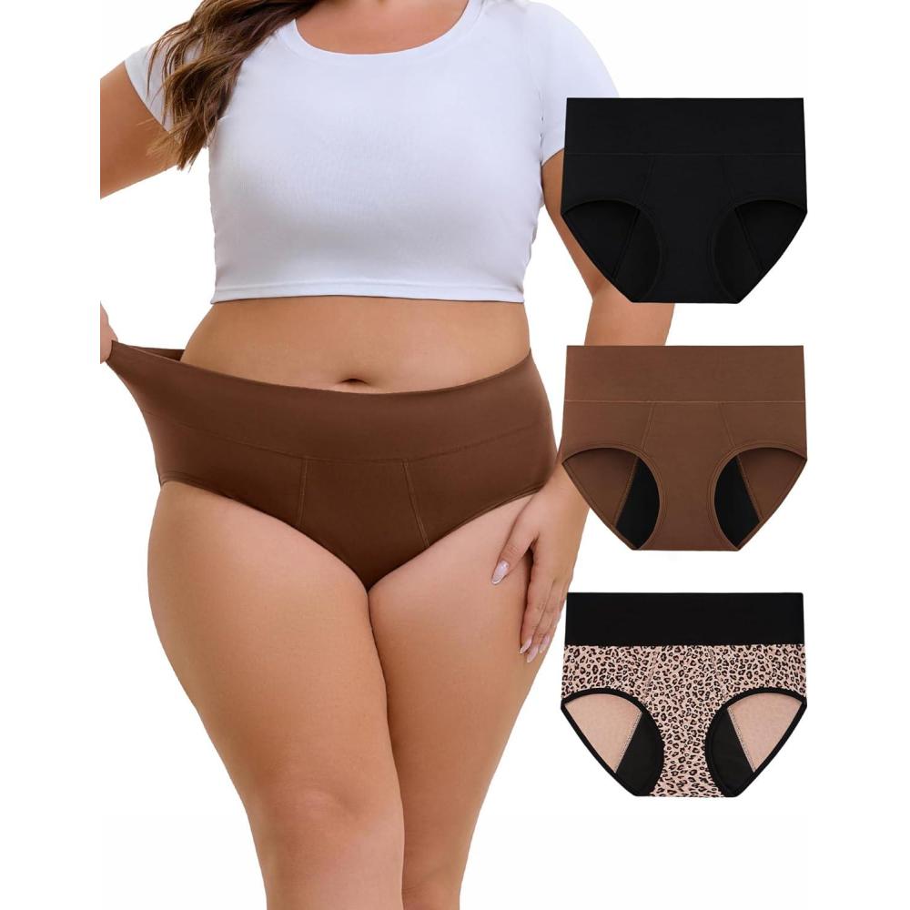 INNERSY Women’s Period Underwear Plus Size Heavy Flow High Waisted Cotton Leak Proof Menstrual Panties 3-Pack(Leopard Print)
